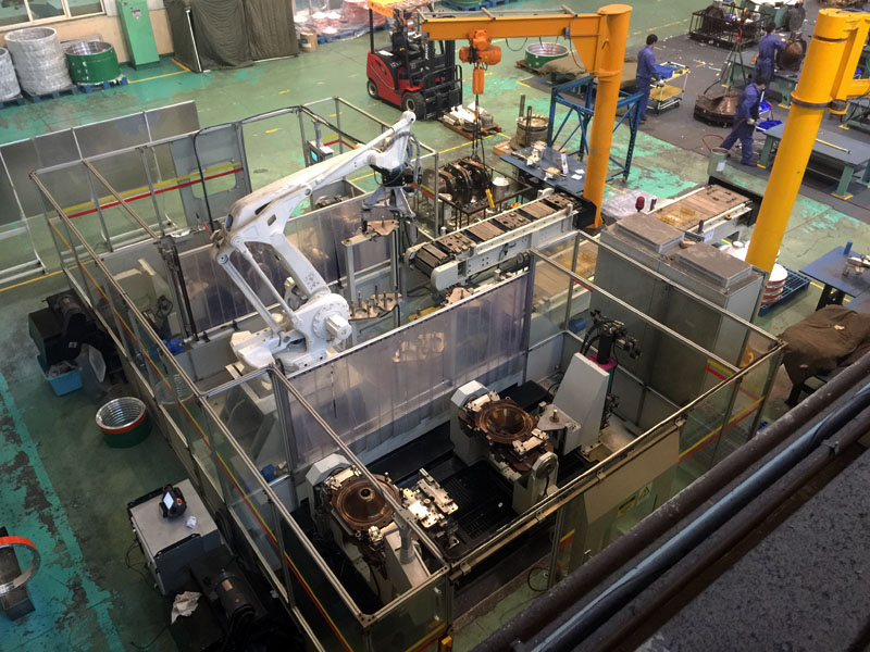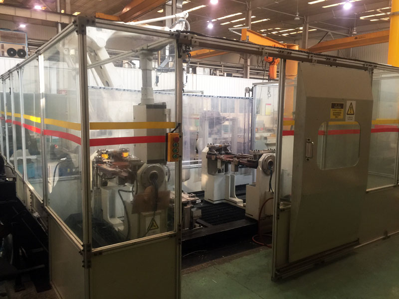 该项目是国内高压电气开关行业的第一套自动装脱模设备,也是北自所承建的第一套高压电气开关行业的机器人应用工作站。该工作站采用1台机器人,2台自动装脱模机,2台排屑机,2条输送线,2台悬臂吊及其配套设施和控制系统。整个工作站可实现生产自动化、数据信息传输网络化、管理规范化、设备监控现代化等多项自动化功能。