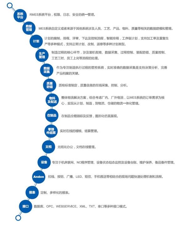 RMES 3.0系统是北自所针对制造行业专门设计研发的MES系统平台,具有自主知识产权,是在原有MES 1.0和2.0的基础上,在工艺流程可配置、移动应用等方面进行了全面提升。RMES 3.0包含生产建模、计划、制造过程、质量、仓储物流、ANDON等管理模块,并结合智能移动应用、大数据处理、智能报表平台等先进技术,实现了发动机装配制造过程的数字化管控,从订单下达到产品完成的整个生产过程进行优化管理,对工厂事件及时作出响应、报告、跟踪及处理。该系统在组织管理企业制造流程、优化工艺流程和仓储物流、切实提高制造和管理效率、降低生产成本等方面发挥了明显的作用,是精益生产、精益物流等管理思想在企业的良好载体和实践平台,是企业践行两化融合、推进智能制造的核心方案。目前RMES 3.0已成功应用于国内众多企业。