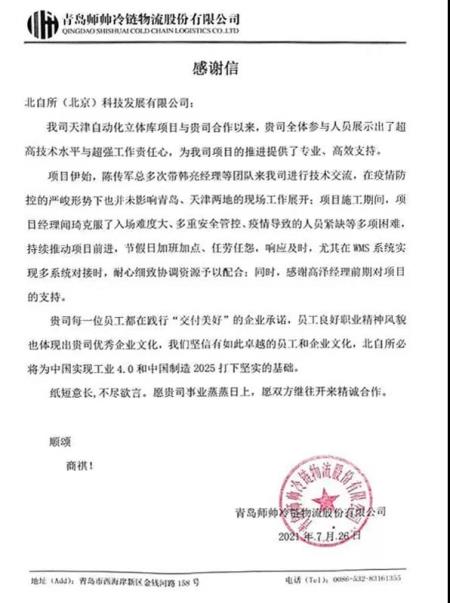 项目执行过程中,正值新冠疫情在我国冷链行业肆虐之时,北自科技团队展示了良好的精神风貌和职业素养,克服了重重困难,以认真的态度、专业的管理和过硬的技术感动了客户,客户特地发来感谢信,以表彰北自科技团队在项目中的突出表现。