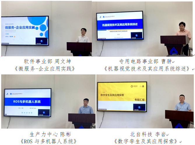 会上,来自软件事业部的周文坤、专用电路事业部的曹翀、生产力中心的陈彬以及北自科技的李岩四名青年技术骨干,分别从基础概念、发展趋势、在智能制造领域的应用、关键技术点及常用工具几个方面,进行了讲解。通过详细的论述,并结合丰富的实例,为参赛队伍提供了技术支持,增加了青年在对应研究方向上的知识储备,夯实了研发基础。