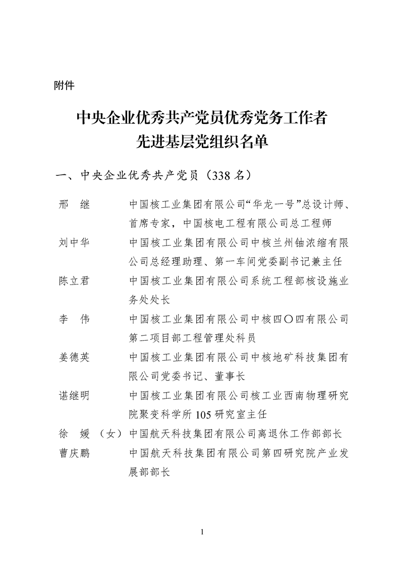 为表彰先进、弘扬正气,激励各级党组织和广大共产党员在把握新发展阶段、贯彻新发展理念、构建新发展格局中奋发有为、建功立业,国资委党委决定,授予邢继等338名共产党员“中央企业优秀共产党员”称号(含追授2名),授予王军艳等205名党务工作者“中央企业优秀党务工作者”称号,授予中国核工业集团有限公司福建福清核电有限公司党委等448个基层党组织“中央企业先进基层党组织”称号。这次表彰的优秀个人和先进集体是中央企业各条战线上的杰出代表,他们的先进事迹和崇高精神充分展示了新时代共产党人的先进性和纯洁性,生动诠释了中央企业共产党员的初心和使命,彰显了国有企业先进精神的无穷伟力。