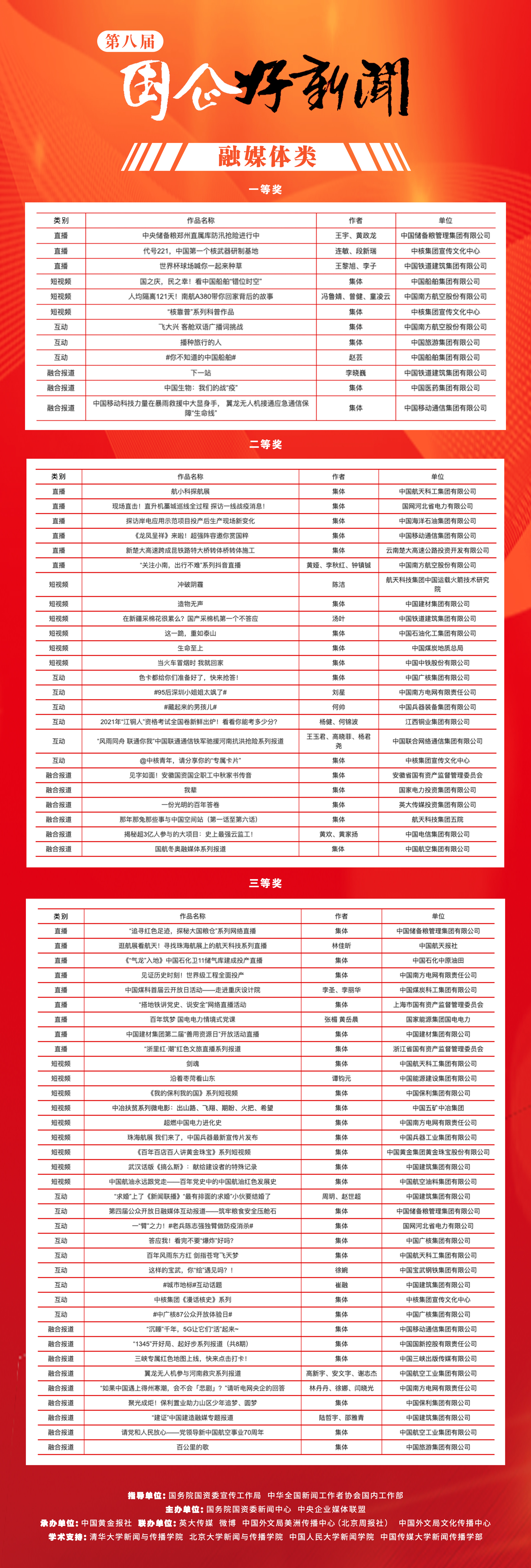 1月11日,第八届“国企好新闻”推介历经单位推荐(自评)、专家复评、终评、公示等环节,3772件申报作品中,227件精品荣膺“国企好新闻”。其中,一等奖32件、二等奖66件、三等奖99件,优秀奖20件,专家评委会还给予主流媒体的10篇精品力作“特别奖”;20个单位获得组织奖,5个单位荣获突出贡献奖,10名新闻创客从73位申报者中脱颖而出,为国资国企宣传队伍和主流媒体搭建交流、对标平台,汇聚国资正能量、传播国企好声音。这些“国企好新闻”作品,生动地再现了极不平凡的2021年国企改革发展党建,清晰地勾勒了可亲可爱可敬的新国企形象。
