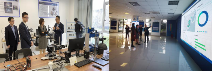首先,潘总带领王处等人参观了基地的人才培养培训中心、智能设计与仿真应用研究室、机器视觉研究室、智能制造诊断平台。